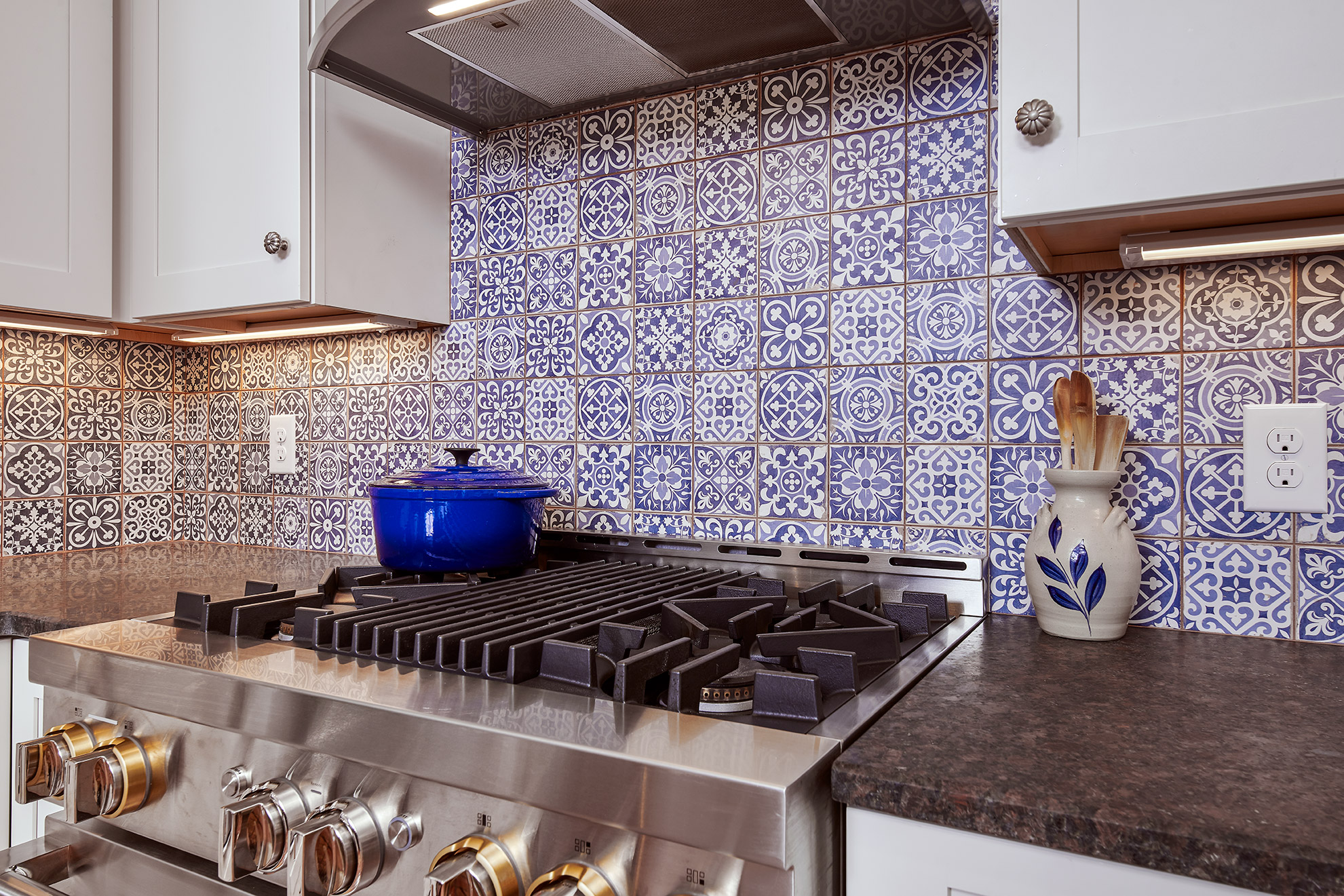 This new kitchen serves up some Spanish vibes with Saltillo tile floors and stained beams mixed with hand painted clay backsplash. Our client loves soft blues and white which was the basis for our design. The original cramped kitchen is now double in size with a perfect prep island that can be moved if she so desires.